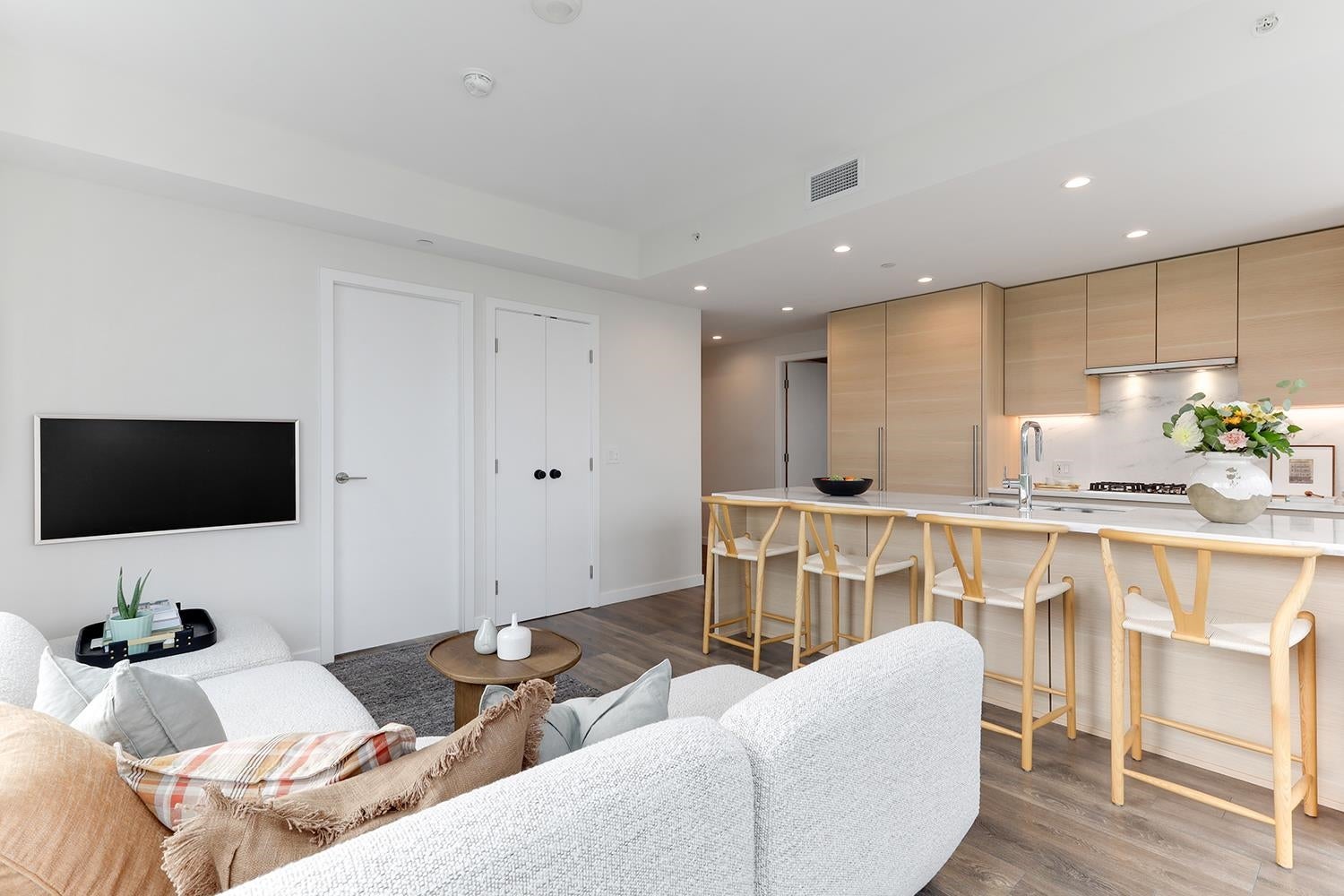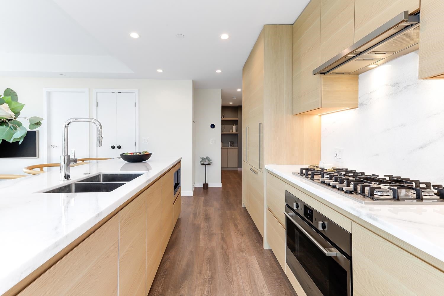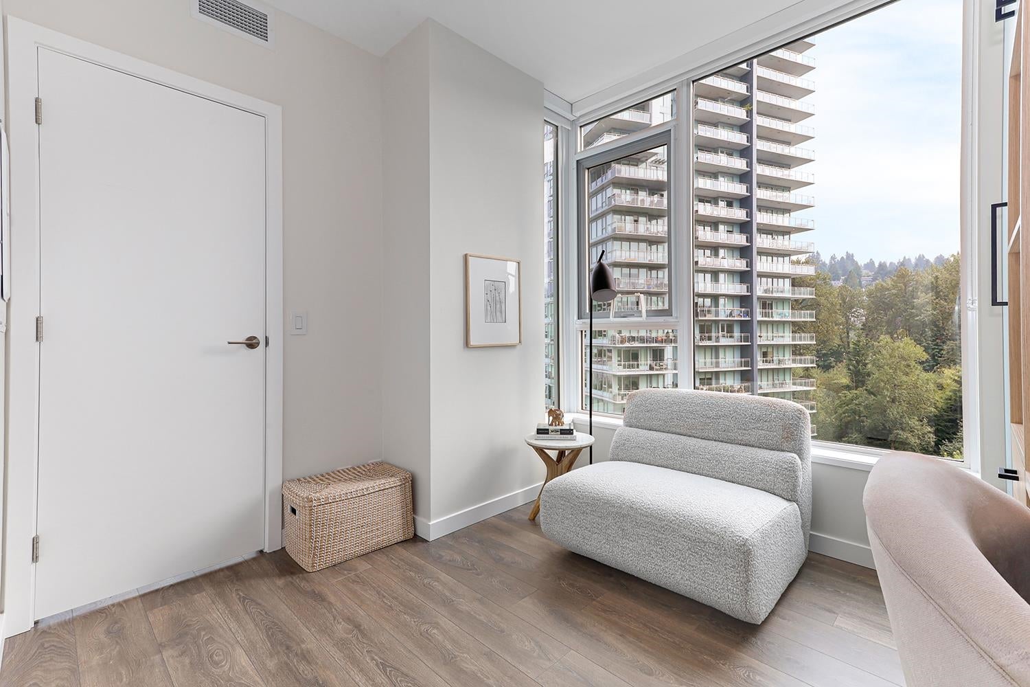 SPECTACULAR 2 Bed, 2 Bath Corner Home | Premier Concrete Building in Port Moody This 3-year-old residence combines modern elegance with comfort. Featuring 9-foot ceilings, air conditioning, and peaceful green space views. Incredibly low maintenance fees! Over $35,000 in custom upgrades including: a Ecobee smart thermostat, designer paint throughout, built-in shelving and drawers in all closets. Nu-heat floors in the ensuite, walk-in closet, upgraded fixtures, hardware, and new carpeting in the principal bedroom. Chefs kitchen w/ fully integrated euro-appliances, gas range, stone island & countertops. EV parking stall & full size storage locker. Walk to shops, transit, trails. Amenities include an outdoor pool, guest suites, fitness centre, & more. OPEN HOUSE SAT & SUN FEB 14/15 1-3PM